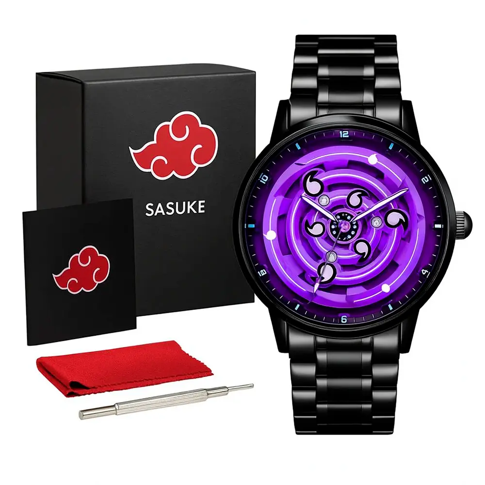 Canalize a intensa ambição de Sasuke Uchiha com um relógio que reflete sua jornada e fogo incontroláveis. O mostrador giratório do Eterno Mangekyō Sharingan simboliza sua trajetória complexa — da vingança à redenção. Construído em aço inoxidável de alta qualidade, este design captura tanto a elegância quanto a potência bruta de Sasuke.